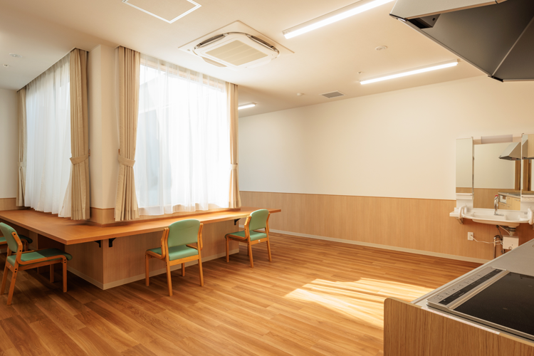 成人女性専用の共同生活施設。木のぬくもりを感じるあたたかな雰囲気で、坪庭を囲むようにカウンター席を配したダイニングが当施設のシンボルです。