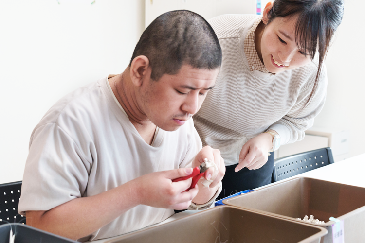 就労に向けての知識と能力向上の訓練、就労と作業活動の機会を提供する通所型施設です。新しい仕事を取り入れたり、地域の企業と連携したりすることにより、工賃の向上と利用者さまの能力や希望に合わせた作業の提供を心掛けています。